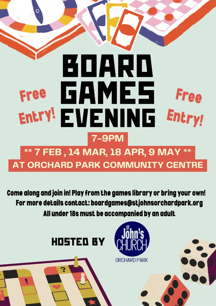 - Board Games Nights: Sat 7th Feb & 14th March, 7 – 9 pm